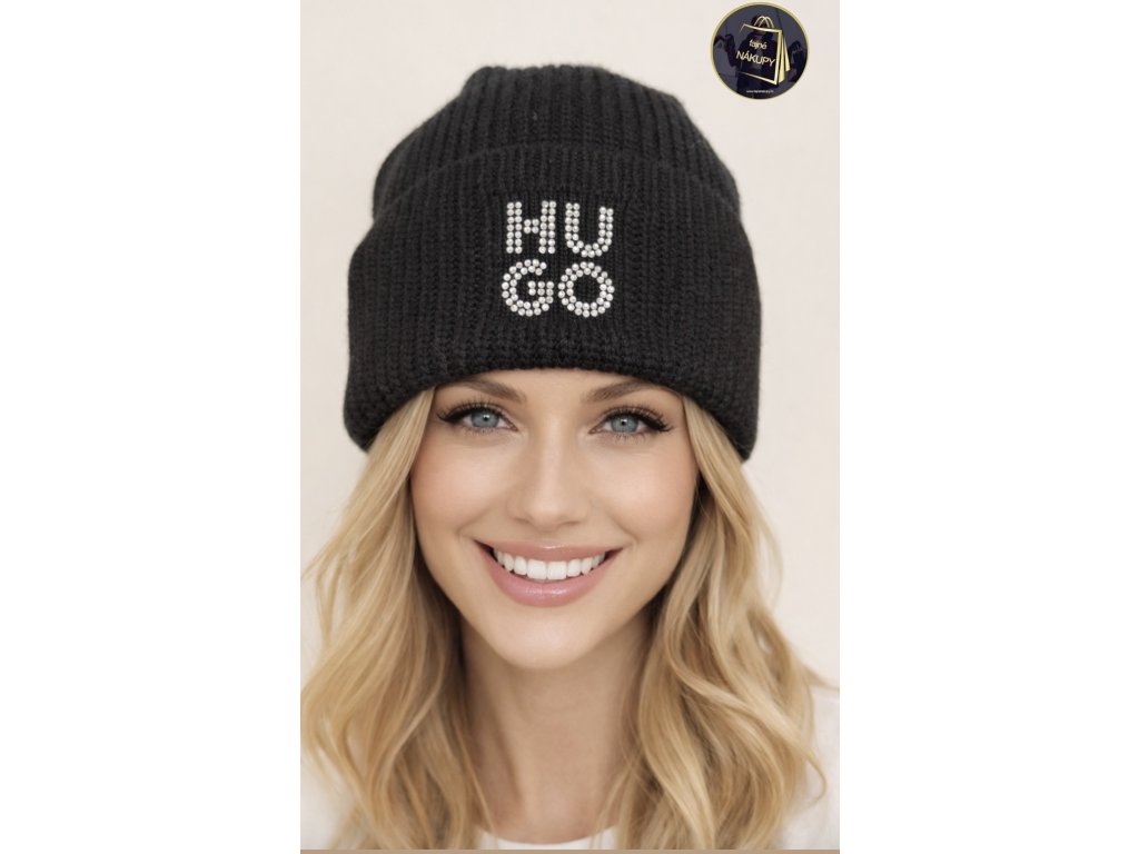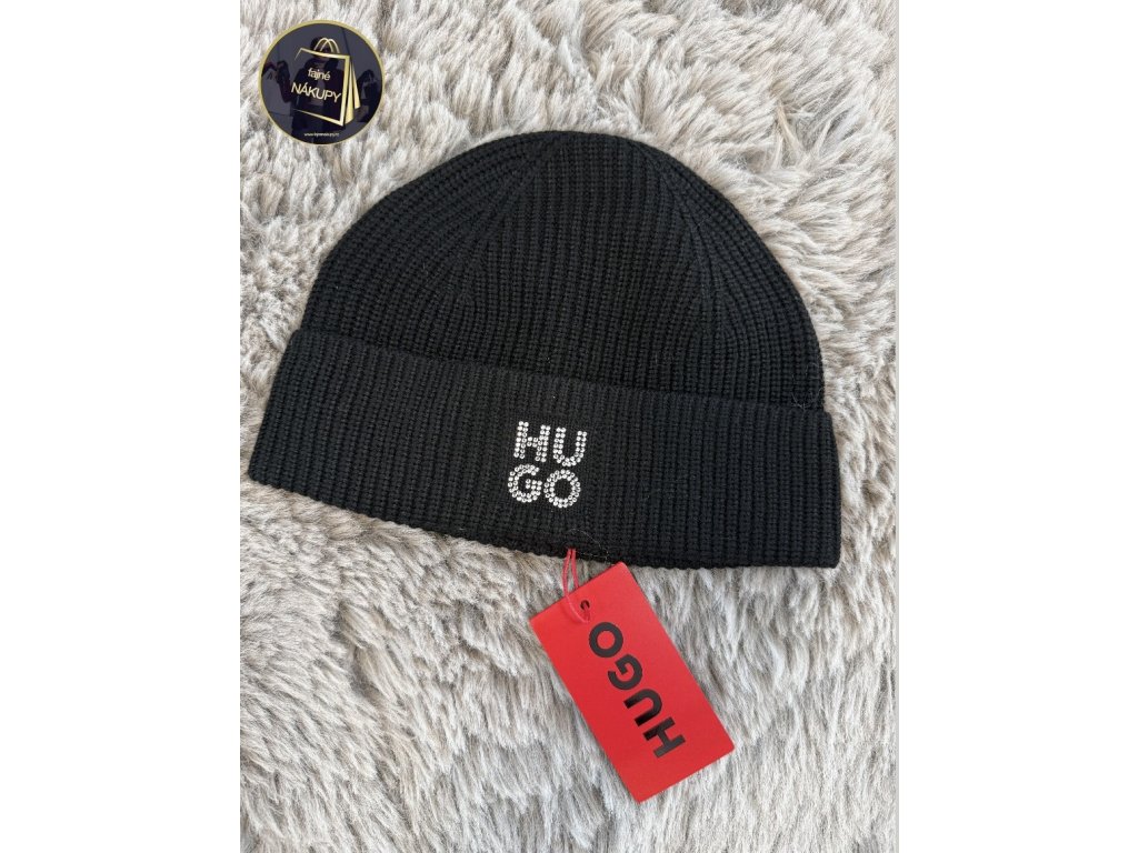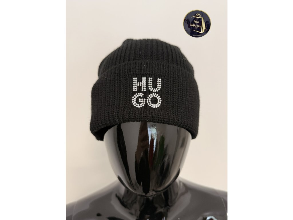 Dámská čepice HUGO BOSSnová, s visačkoučerná, kamínkové logo60 % vlna, 40 % akryluni vel. - výška cca 20, 5 cm - po obvodu pruží