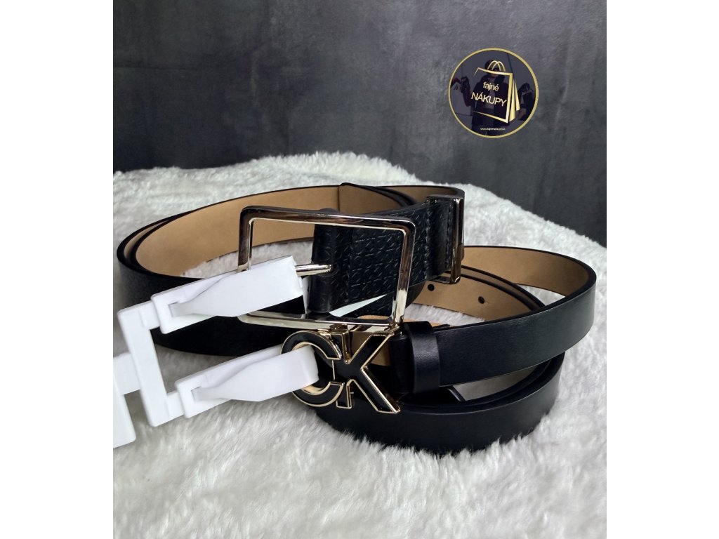 Duo pack dámských opasků CALVIN KLEINnové, s visačkoulogovaný se stříbrnou sponou, šíře 3,1 cmtenký se zlatočernou sponou, šíře 2 cmvel. M - délka bez spony k první dírce 79 cm, k poslední dírce 94 cm